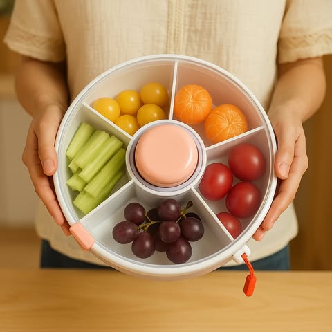 -Dank des drehbaren Designs wird das Snacken zum Vergnügen! Mit einem einfachem Druck auf den interaktiven Knopf in der Mitte lässt sich der Behälter bequem drehen. Kombinieren Sie verschiedene Snackschalen und -becher in einer leichten, benutzerfreundlichen Lunchbox.